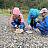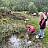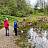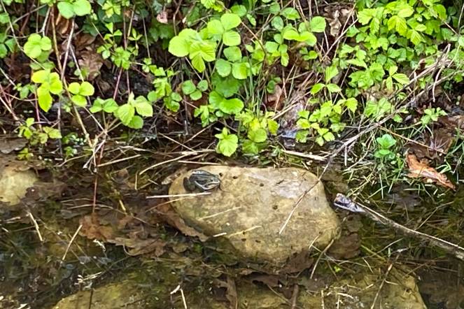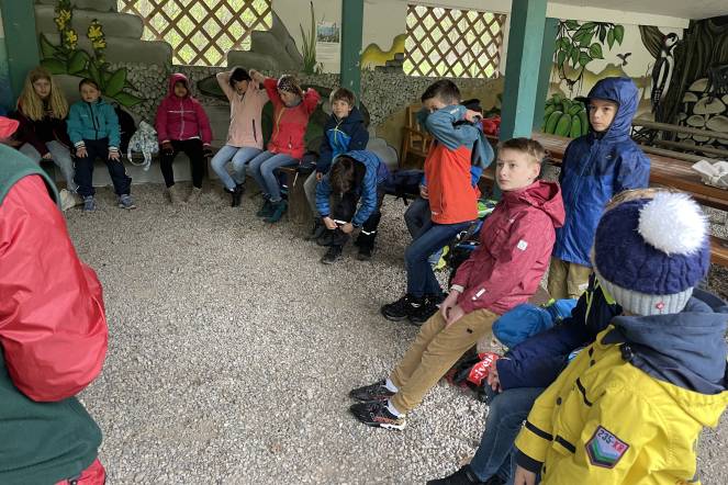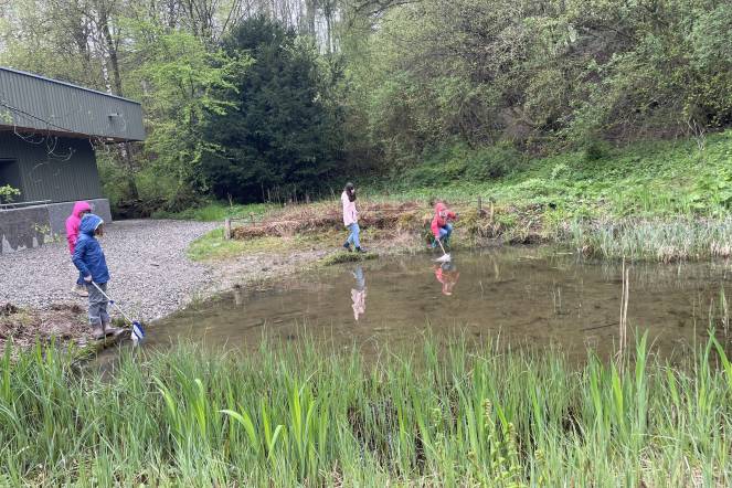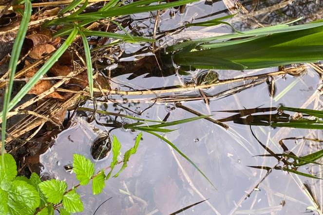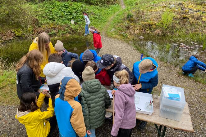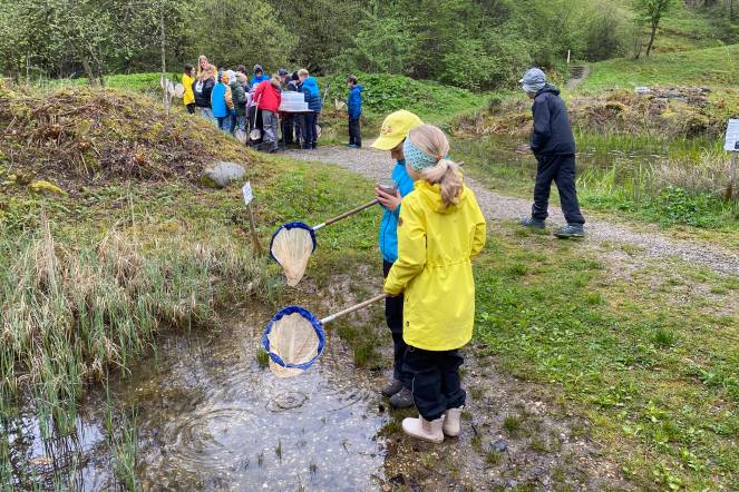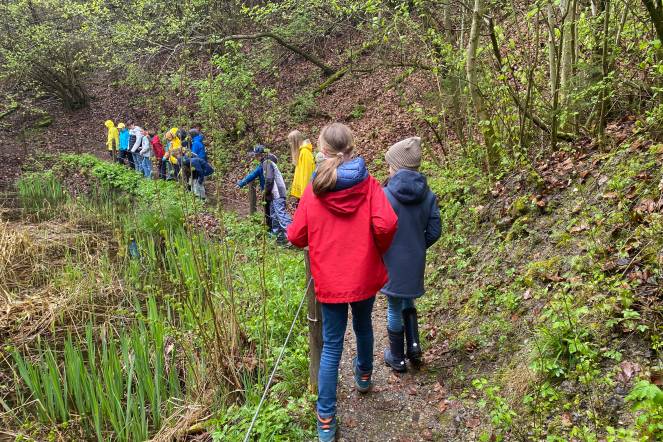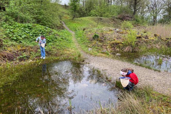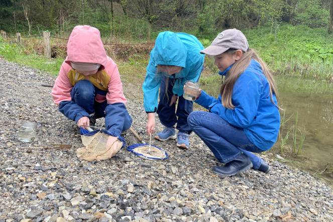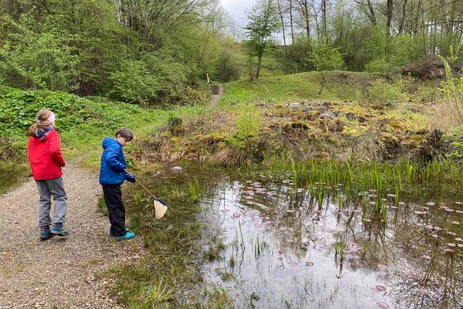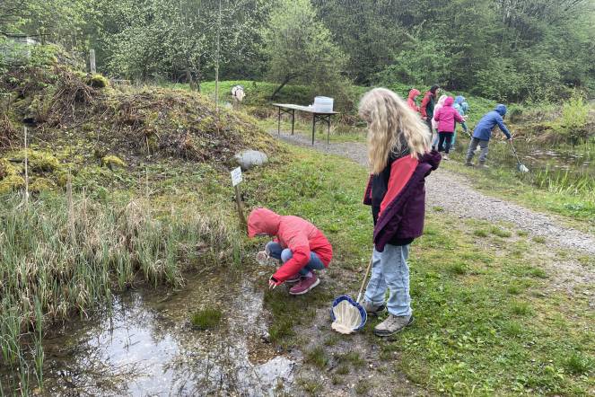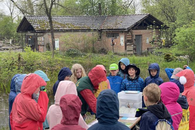 Zuerst wurde der scharfe Blick geschult, indem die Kinder auf dem Areal versteckte Plastiktierchen suchen durften. Das war ganz schön knifflig! Gut aufgewärmt, tauchten wir auf einem Rundgang entlang von Teichen, Tümpeln und Weihern in die Welt der Tiere und Pflanzen am und im Wasser ein. Trotz des Regenwetters, gelang es den Kindern, Frösche und andere Tiere zu entdecken.