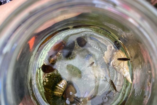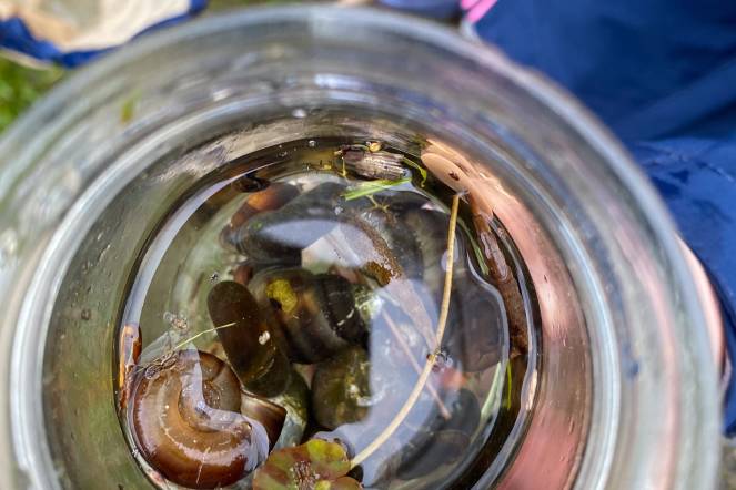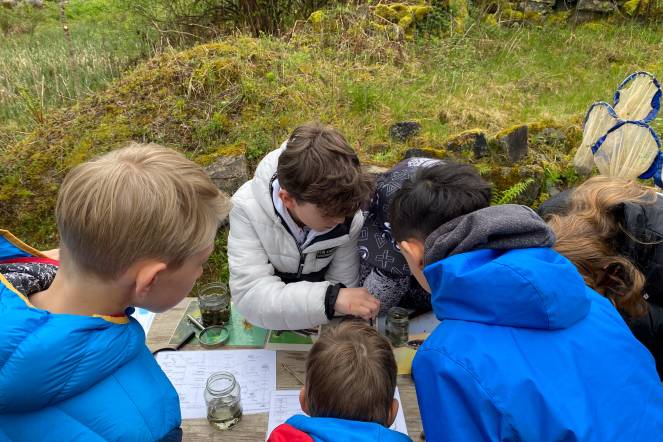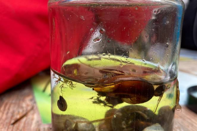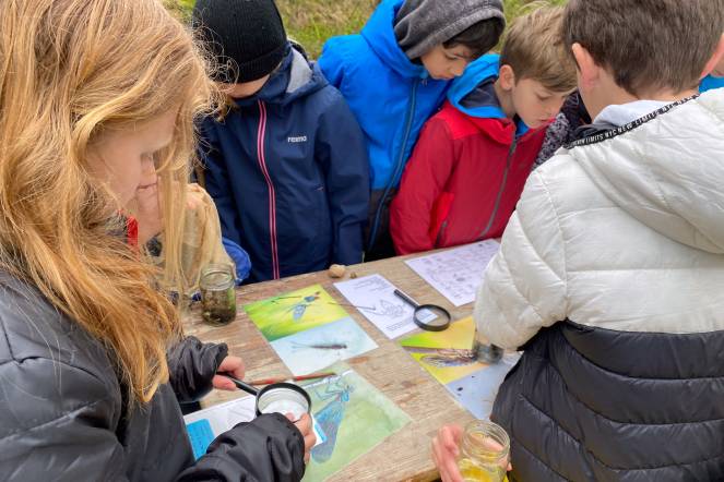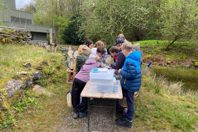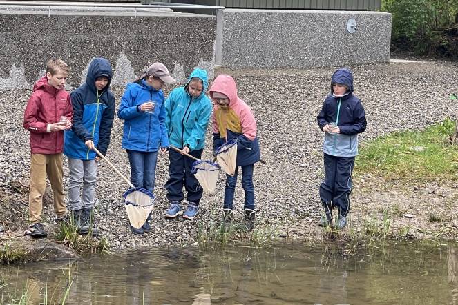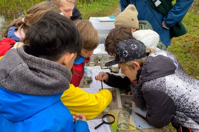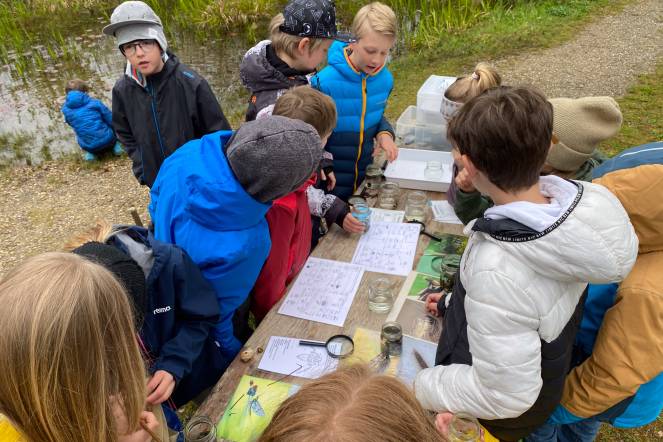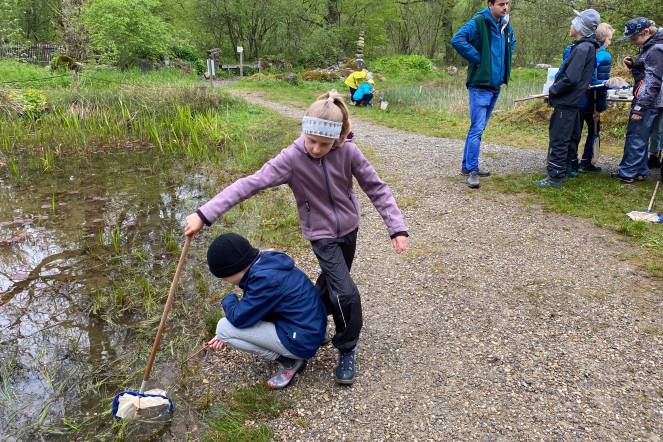 In einem zweiten Teil war dann das Fangen, Beobachten und Freilassen von Wassertieren erlaubt. Der Entdeckergeist der SchülerInnen war sofort geweckt! Mit Fangnetzen, Gläsern und Lupen ausgerüstet, erforschten wir den Lebensraum Teich. Die Kinder waren sofort begeistert und haben sich auf die Suche gemacht. Plötzlich bekamen auch die kleinsten Lebewesen eine Bedeutung. Natürlich war der Sammlerinstinkt schnell geweckt und die Gläser füllten sich mit Wasserläufern, Wasserschnecken, Gelbrandkäfern, Piratenspinnen und vielem mehr. Eine Gruppe fing sogar ein sehr seltenes Wasserskorpion. Mittels vereinfachter Bestimmungsschlüssel und der Unterstützung der anwesenden Experten, konnten die Kinder die Wassertiere selber bestimmen. Das Fangen von Laich, Kaulquappen und Fröschen ist nicht erlaubt, da die Amphibien geschützt sind.