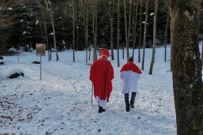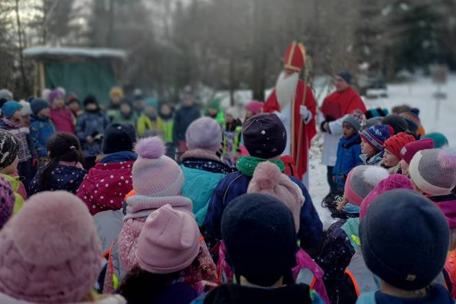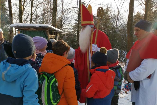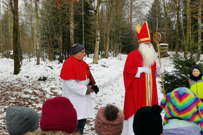 Wenige Tage später besuchten wir den Samichlaus im Wald. Unsere geübten Versli und Lieder sprachen und sangen wir dem Samichlaus gerne vor. Zur Belohnung für das Üben des kleinen Ständchens hatte der Samichlaus jedem Kind ein kleines, aber feines Chlaussäckli verteilt.