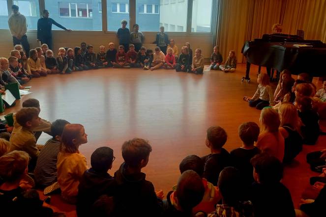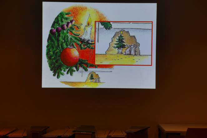 Zum Abschluss der gemeinsamen Aktivitäten trafen sich alle 1./2. Kinder zum erneuten Singen. Zudem wurde von den Lehrpersonen den Kindern die Geschichte «Ein kleines Stück vom Glück» erzählt. Dabei haben die Kinder erfahren, dass Teilen glücklich macht.