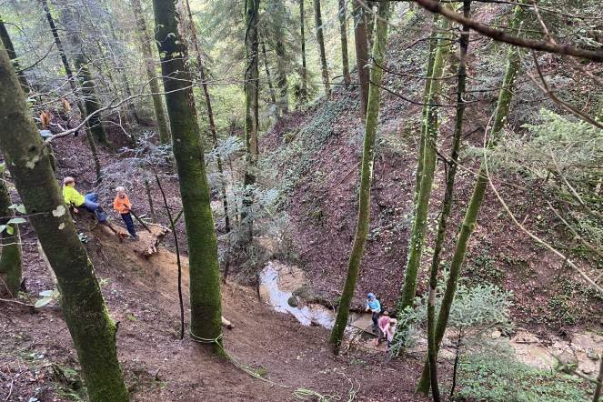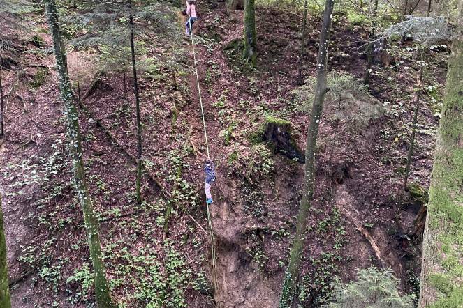 Ich fand, gestern war es mega cool, weil wir mit dem Seil runtergehen konnten. Es war alles voll mit Dreck und Matsch. Ein paar von den Jungs sind in den Bach gefallen. (Julia)