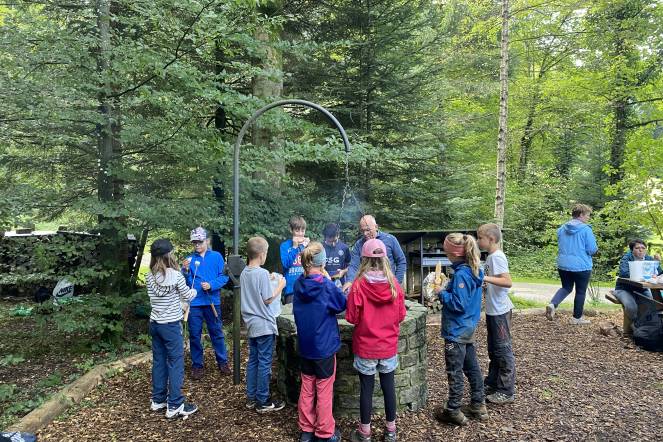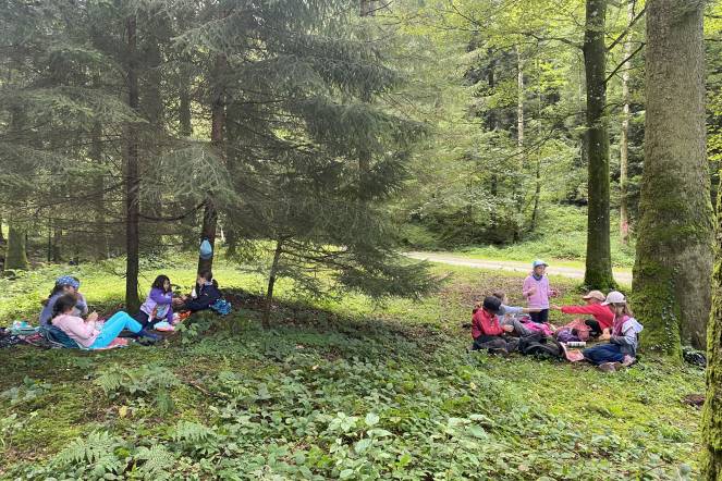 Wir sind zur Flüsskapelle hochgelaufen. Wir sind runter zum Bach geklettert. Ich habe beim Znüni meiner Wurst alle Beine abgegessen. (Laura)