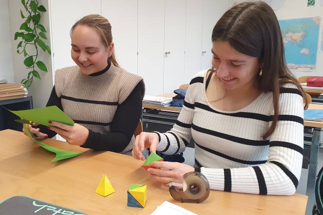 Warum muss bei einer Pyramide das Volumen durch drei dividiert werden? Um das zu verstehen, verwenden wir im Mathematikunterricht auch mal Schere und Klebeband und bauen uns die Pyramiden auf. Schon bald merkt jede/r Lernende: aus genau drei rechtwinkligen Pyramiden kann ein Würfel gebaut werden.
