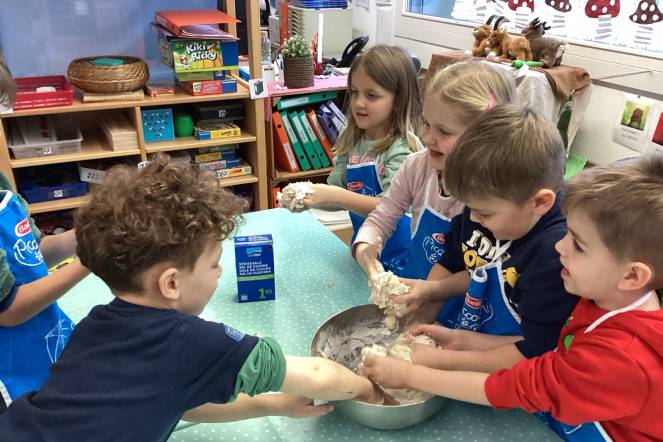 Seit dem Start nach den Weihnachtsferien erleben die Kindergartenkinder der Kindergärten A und C viele Abenteuer in der Märchenwelt. Passend zum Märchen «Frau Holle» verwandelten wir unsere Kindergärten in eine zauberhafte Schneelandschaft. Die Kinder durften mit unterschiedlichen Materialien Brunnen bauen, sie lernten ein eigenes Kissen zu nähen, wie die fleissige Goldmarie und sogar selber Brot zu backen. Natürlich wurde das Mehl, wie zu alten Zeiten, mit der Mühle selbst gemahlen. Sichtlich stolz waren die Kindergartenkinder auf ihr eigenes Brot. Mit verschiedenen Instrumenten wurde das Märchen vertont und von den Kindern gezeichnet. Die Kinder entwickelten sich in der Zwischenzeit zu tollen Geschichtenerzählern und Geschichtenerzählerinnen und können das Märchen nun in eigenen Worten nacherzählen. Wir freuen und auf die verbleibende Zeit in der Märchenwelt!