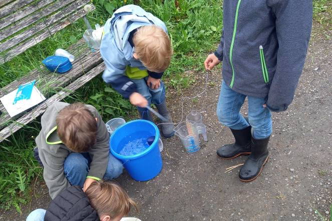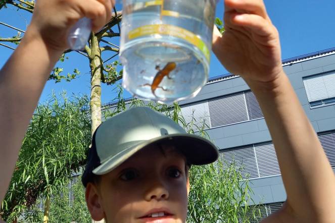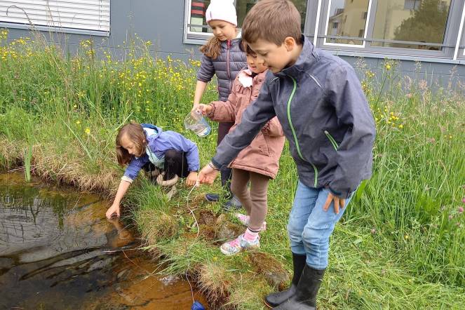 Wer besiedelt den Teich? Wer ist Vegetarier und wer ein gefrässiger Räuber? Wie entwickeln sich Libellen von der Larve bis zum erwachsenen Tier? Welche Strategien gibt es, sich unter Wasser fortzubewegen? Im Rahmen des Ateliers "Wasser" auf der Schulinsel forschen Kinder von der 1. bis zur 5. Klasse am Lernort Teich. Wir beobachten den Teich und die Umgebung, schauen, welche Pflanzen wachsen und messen die Wassertemperatur. Wie können aus dem Wasser Tiere gefangen werden? Und wie müssen wir mit ihnen umgehen? Gleich zu Beginn finden wir eine leere Libellen-Larven-Hülle. "Wäh, scho e chli gruusig - aber mega spannend!" Kurz darauf fliegt auch die erste Libelle vorbei. Die Faszination ist auch gross, als die ersten Kaulquappen eine Woche später Beine entwickelt haben. Als endlich mit gemeinsamem Geschick ein Bergmolch gefangen werden kann, wird interessiert beobachtet wie er sich bewegt und wie lange er unter Wasser bleiben kann, bis er Luft holen muss. Die Entdeckungen werden mit Fotos und Zeichnungen dokumentiert und die Tiere mit Bestimmungskarten und einem Bestimmugsschlüssel bestimmt.
