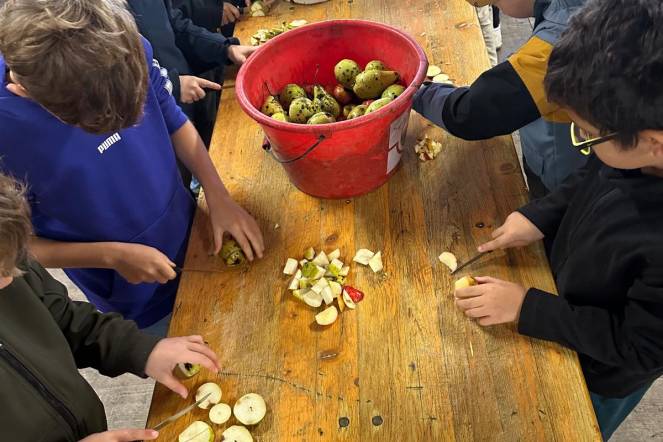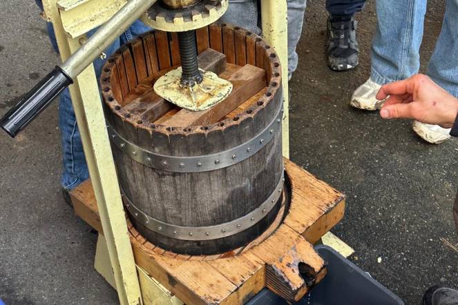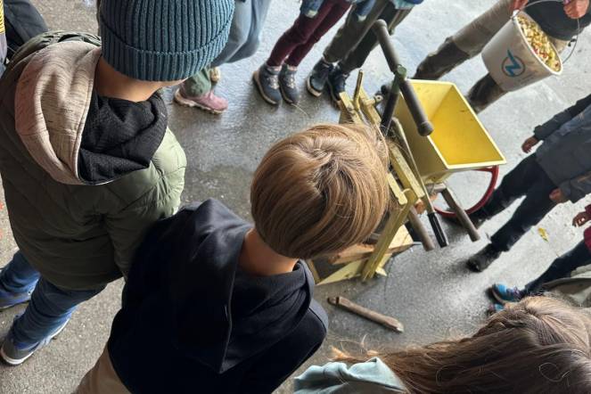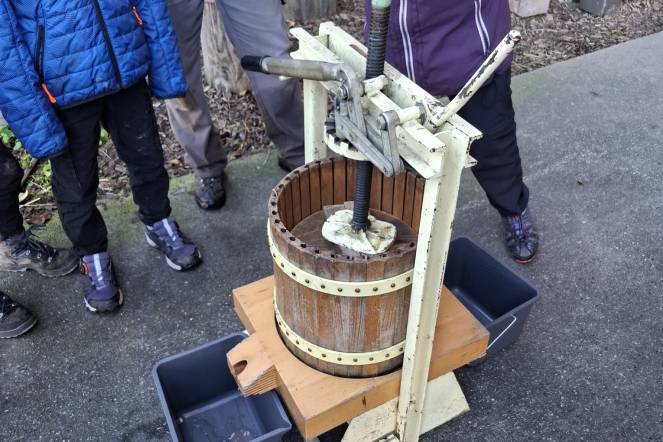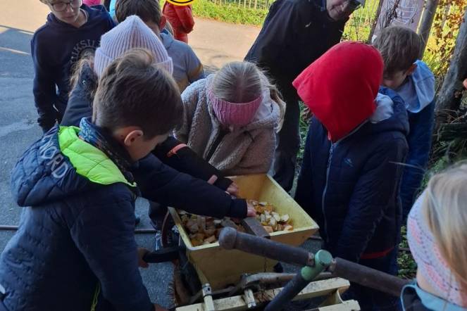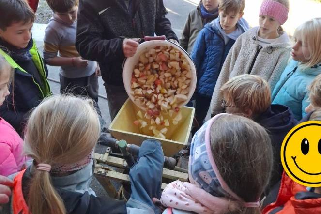 Nach dem Sammeln wurden die Äpfel geschnitten und dann ging’s an die Mostmaschinen. Keine riesige Anlage, sondern mehrere kleine, mechanische Geräte, die mit Muskelkraft betrieben wurden. Da war Teamarbeit gefragt – und ganz schön viel Kraft! Die Kinder kurbelten, pressten und staunten, wie aus den Äpfeln langsam der Saft herauskam.