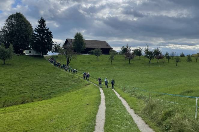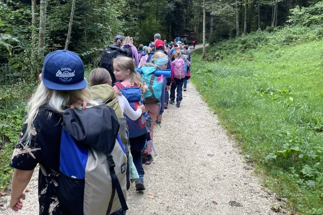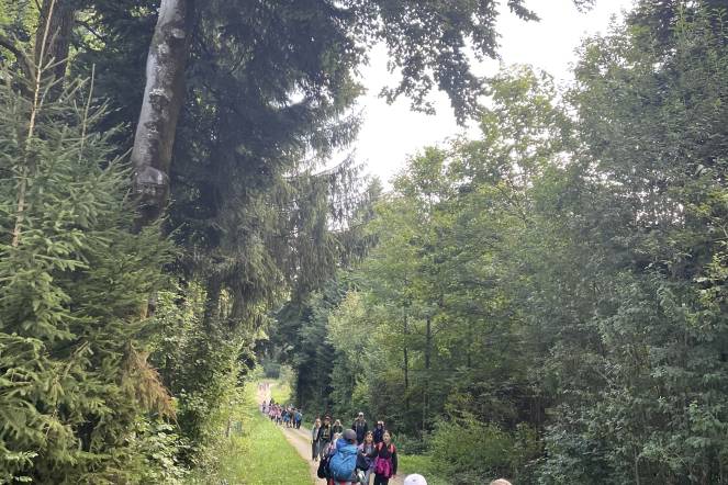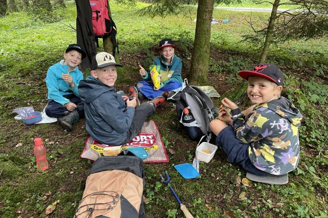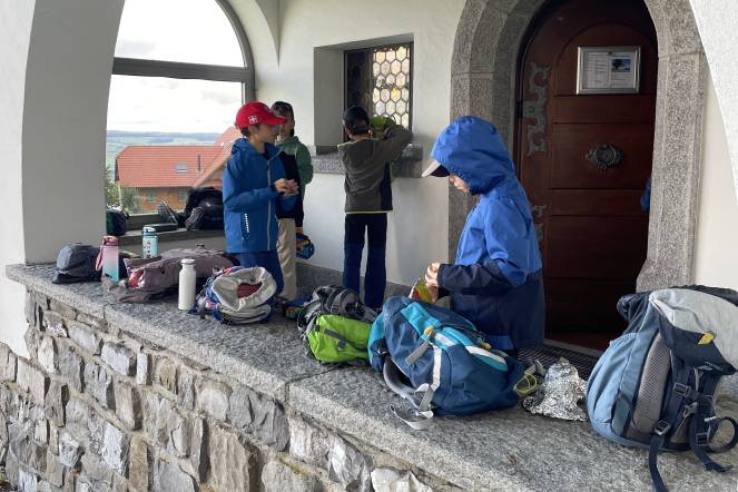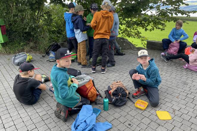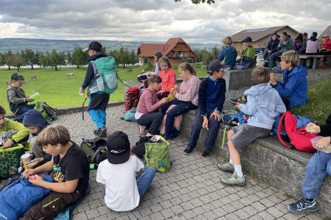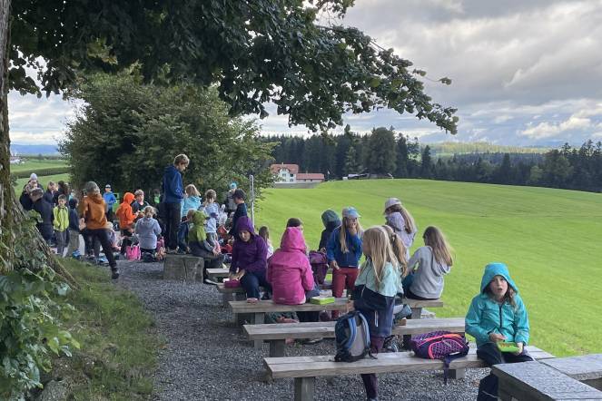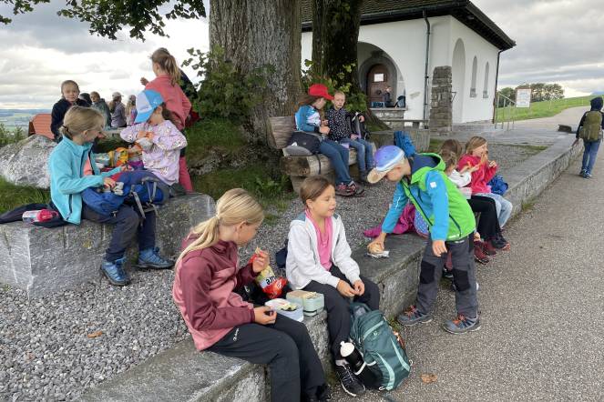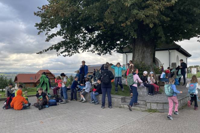Letzten Donnerstag war es wieder so weit: Unsere alljährliche Herbstwanderung stand an. Nach einem ersten Anstieg gab es bei windigem Wetter eine Znünipause bei der Flüsskapelle. Frisch gestärkt machten wir uns auf den Weg in Richtung Neuenkirch. Bei der Grillstelle Sparrenhüsli verbrachten wir unsere Mittagspause. Die Kinder nutzten diese Zeit, um ihr Picknick zu essen, die Wurst zu bräteln, zu spielen und den Wald zu erkunden, oder sich die zahlreichen Hänge hoch und runter zu seilen. Es war ziemlich matschig, machte jedoch viel Spass. Nachdem alle Kinder ihren Rucksack wieder gepackt hatten, machten wir uns auf den Heimweg. Zum Glück ging der Weg mehrheitlich geradeaus oder bergab. Mit müden Beinen erreichten wir das Schulhaus. Es war ein erlebnisreicher Tag!