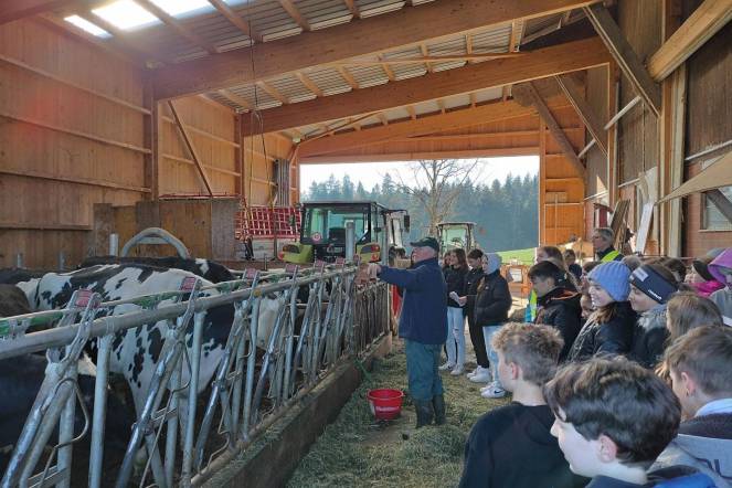 Die 6. Klässler:innen fuhren vom Schulhaus Nottwil in einer Reihe mit dem Fahrrad zum Bauernhof von der Familie Wespi. Marie-Louise und Toni Wespi haben uns bereits erwartet, als wir angekommen sind. Als erstes haben wir die jungen Kälbchen betrachtet. Es hatte 2 Mädchen und 4 Jungs-Kälbchen. Sie wurden kurz nach der Geburt, nachdem sie noch die Biestmilch trinken durften, von der Mutterkuh getrennt. Als nächstes sahen wir Kühe, die nicht mehr gemolken werden, weil sie schon bald ein Kalb bekommen. Anschliessend sahen wir den Auslauf der Kühe. Kühe sind gerne draussen. Bei Wespis können die Kühe selber entscheiden, ob sie drinnen oder draussen sein möchten. Im Stall drinnen brannte das Licht. Kühe lieben helles Licht. So brennt das Licht 16 Stunden pro Tag. Anschliessend haben wir den Melkstall gesehen. Dort laufen die Kühe selbständig hinein. Der Bauer steht unter der Kuh und säubert die Zitzen. Anschliessen wird die Melkmaschine an die Kuh angesetzt und pumpt die Milch ab. In dieser Zeit laufen auf der anderen Seite schon die nächsten Kühe hinein. Wenn die Kühe fertig gemolken sind, verlassen sie selbständig den Melkstand. Bis alle Kühe fertig gemolken sind, dauert es etwa eine Stunde. Die Milch gelangt in einen 650 Liter Tank und wird jeden Morgen von einem Lastwagen abgeholt. Sie kommt dann in eine Käserei in Windblosen. Dort wird aus der Milch Emmentaler-Käse hergestellt. Wir konnten den Käse probieren: er ist lecker! Ebenso konnten wir die Rohmilch kosten.