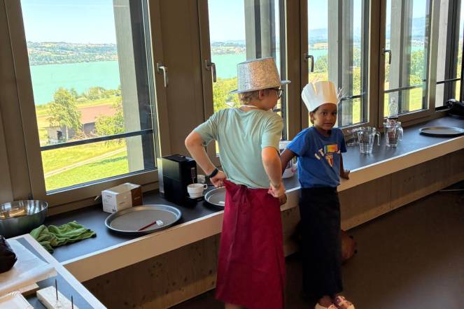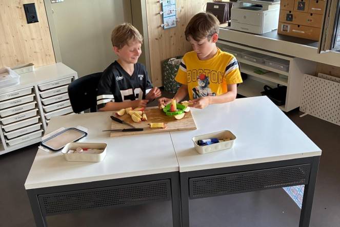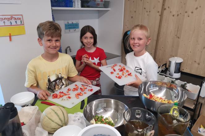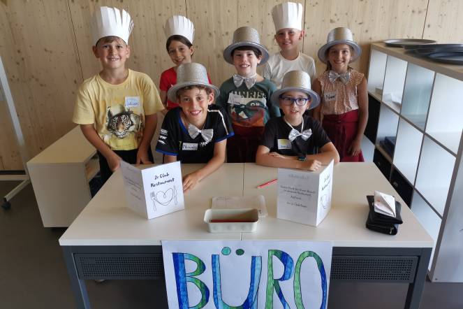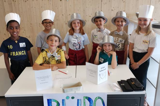 Im Fach Deutsch haben die Schülerinnen und Schüler geübt, wie man richtig telefoniert und Reservationen entgegennimmt oder wie man etwa freundlich ein Gespräch mit Gästen führt. Während 2 Lektionen konnten die Eltern uns telefonisch erreichen und einen Platz in einem der 3 Restaurants reservieren. Im NMG wurde besprochen, was für Akteure rund um ein Restaurant überhaupt beteiligt sind. Verschiedenste Aufgaben wie Kochen, Tisch decken, Servieren, Abräumen, … wurden geklärt und geübt. Es wurde besprochen, worauf man beim Einkauf der Lebensmittel achten kann und was die Wörter «Food Waste» bedeuten. Auch im Fach Mathematik wurde geübt. Die Kinder lernten, wie man Abrechnungen schreibt und das Essen bzw. die Getränke der Gäste einkassiert. Damit die Restaurants in schönem Glanz erstrahlen konnten, wurde im BG fleissig gebastelt. Wir bastelten Blumen für die Tischdekoration, Plakate fürs Büro, die Küche und den Empfang, eine hübsche Türkollekte, Portemonnaies für das Spielgeld der Gäste, Kochhüte, …