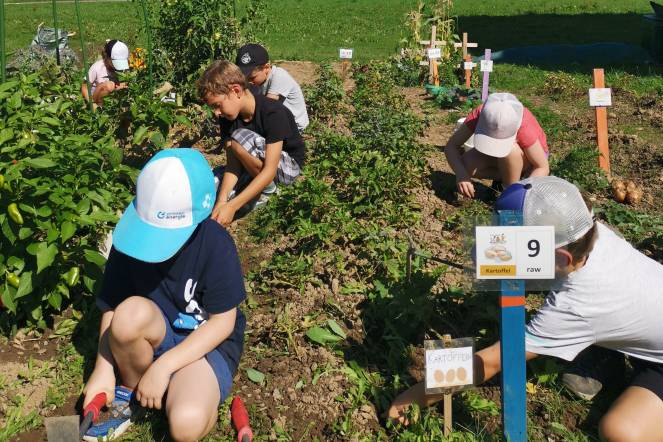 Juhu, es ist Erntezeit! Im Schulgarten der 1./2. Klassen wachsen die angepflanzten Sachen wie verrückt.
