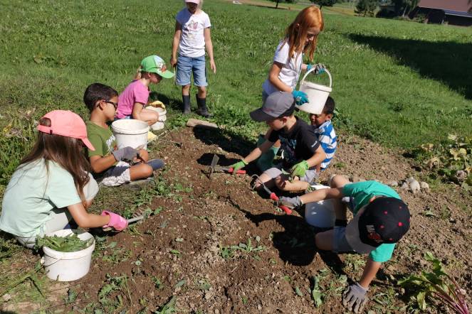 Im Garten der jüngsten Primarschulkinder gibt es jede Menge Gemüse zum Ernten. Dank der Arbeit der Kinder und Lehrpersonen, welche seit dem Frühling immer wieder den Garten gepflegt und gehegt haben, ist alles so schön gewachsen. Die neuen Erstklasskinder durften bis anhin von der Arbeit ihrer Vorgängerklassen profitieren und bereits viele Leckereien aus dem Schulgarten kosten. Nun war es an der Zeit, selbst mal etwas Hand anzulegen. Ganz nach dem Motto «Zuerst die Arbeit, dann das kulinarische Vergnügen» jäteten und beseitigten die Kinder fleissig Unkraut oder gossen die Pflanzen. Zur Belohnung gab es dann ein Gemüse nach Wahl zum Geniessen. 😊
