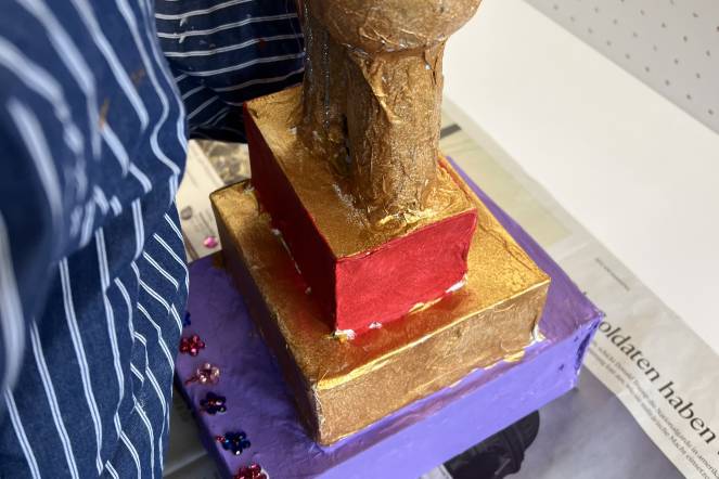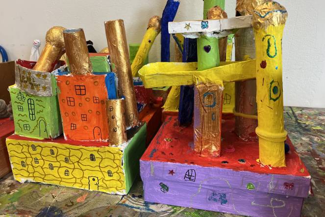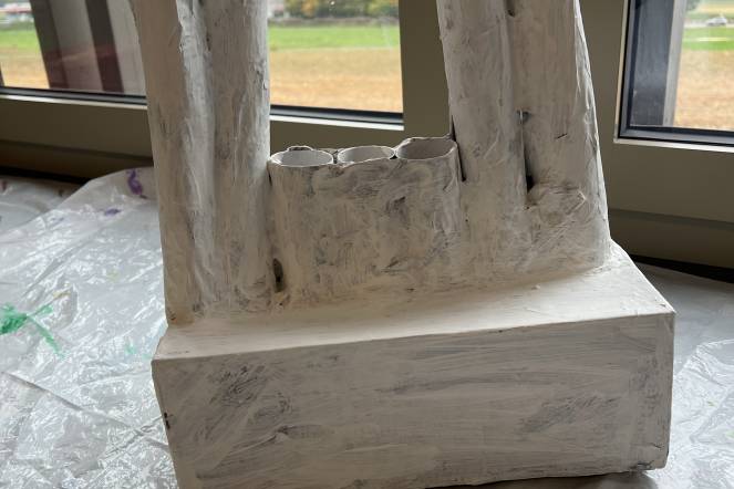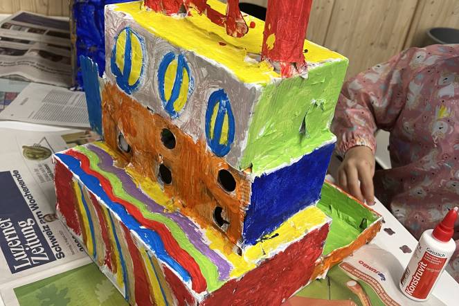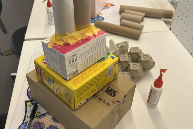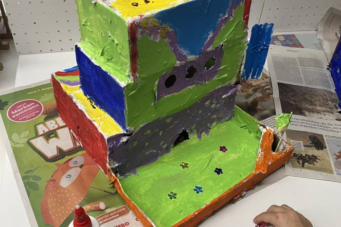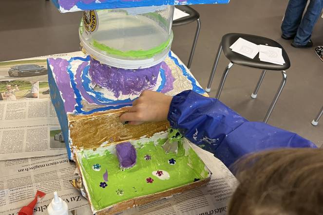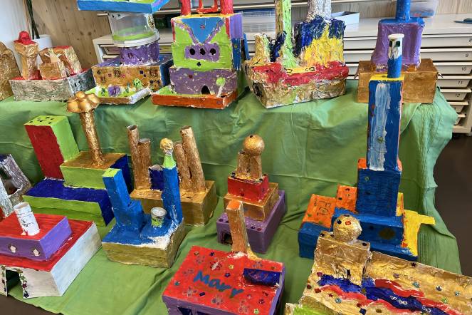 Im BG-Unterricht der 2. Klasse haben wir uns mit dem Künstler Hundertwasser beschäftigt. Inspiriert von seiner Kunst haben die Kinder eigene Hundertwasserhäuser gestaltet. Aus Karton entstanden individuelle Hausformen, die zuerst mit Kleister verstärkt und anschließend weiß grundiert wurden. Danach ging es ans farbige Bemalen, ganz im Stil Hundertwassers: mit geschwungenen Linien, kräftigen Farben und viel Fantasie. Zum Schluss wurden die Kunstwerke mit Goldstiften, Glitzer, kleinen Steinen und weiteren Materialien liebevoll verziert.