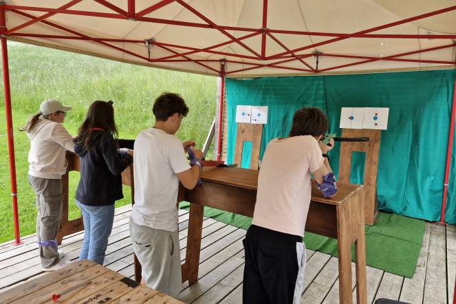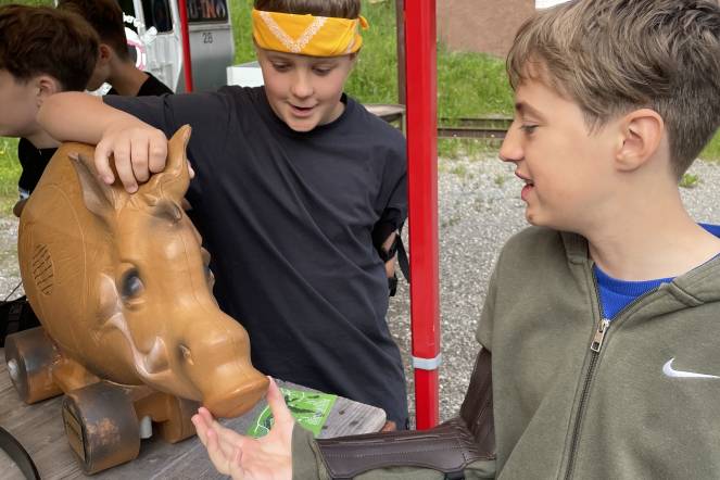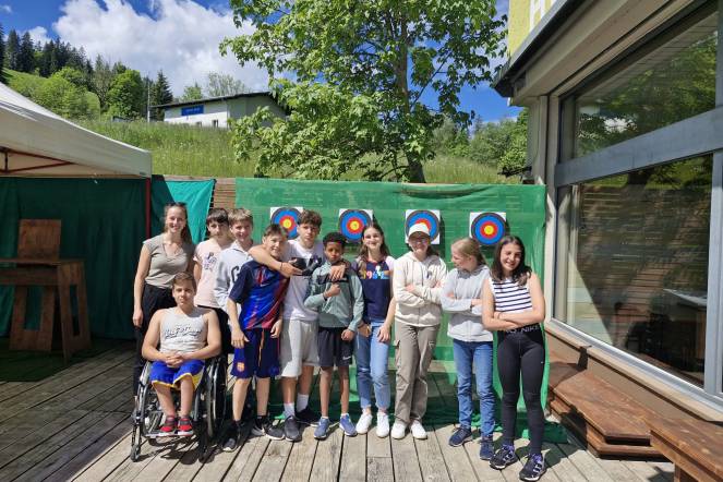 Heute wurden wir um 7 Uhr mit schräger Flötenmusik aufgeweckt. Dann assen wir sehr leckeres Zmorgen. Nachher ging es auf zum Wahlprogramm: einige spielten Minigolf, andere gingen Bogenschiessen, zum Wilhelm Tell Turnier und eine Gruppe Mädels gestaltete Tshirts. Zum Mittagessen gab es sehr leckere Hotdogs. Am Nachmittag gab es ein spannendes Sportturnier in den Disziplinen Basketball, Unihockey, Boccia und Kubb. Nachdem hatten wir viel Zeit für uns und konnten Volleyball spielen und chillen. Dann hat uns die Küchen- Crew mit Fajitas überrascht zum Znacht. Die Kinder hatten grossen Appetit. Beim Abendprogramm von der Klasse 6c konnten wir verschiedene Spiele spielen wie zum Beispiel Versteckis und Kartenspiele. Zusätzlich konnte man sich verwöhnen lassen bei "Beautyzeugs": Gesichtsbehandlungen, Masken, Massagen, Schminken und Frisuren standen zur Auswahl. Man konnte Münzen verdienen und auch Belohnungen kaufen. Danach gingen wir ins Bett.